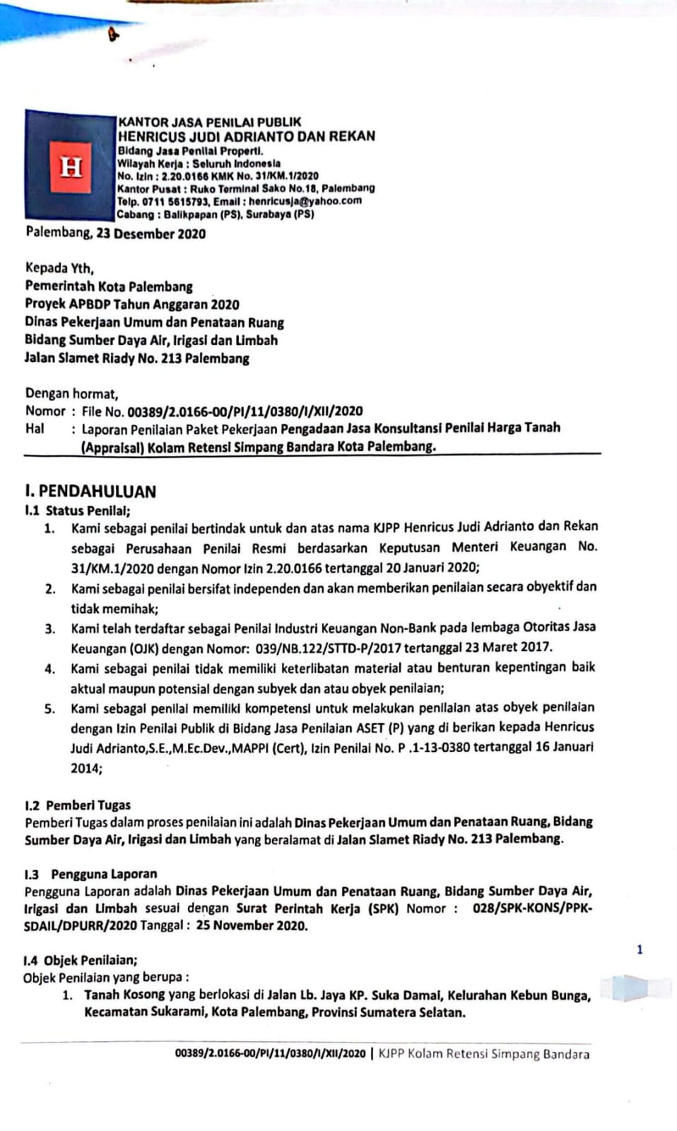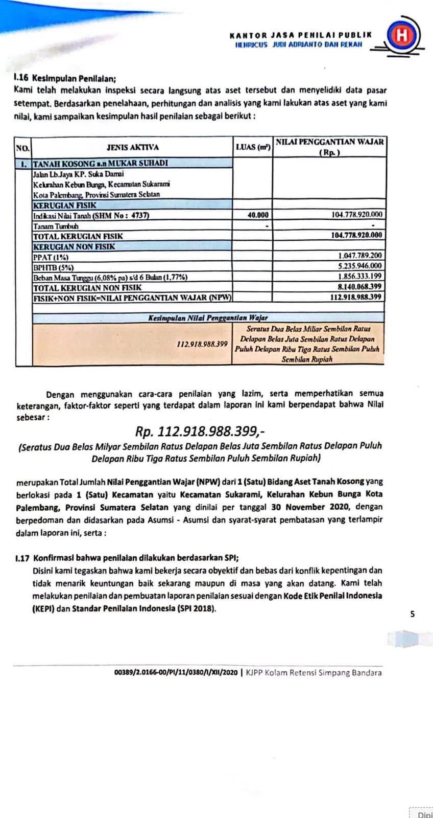 Kantor Jasa penilai (KJPP) Henricus Judi Andrianto memberikan opini harga tanah untuk Sertifikat hak milik atas nama MS no. 4737 dengan luas tanah 40.000 M2 atas permintaan Pemkot Palembang.Opini yang di berikan kantor Jasa Penilai Henricus Judi Adrianto untuk untuk objek tanah bersertifikat No. 4737 adalah senilai Rp. 112.918.988.399,- dengan luas objek tanah 40.000 M2 include BPHTB dan kewajiban lainnya.