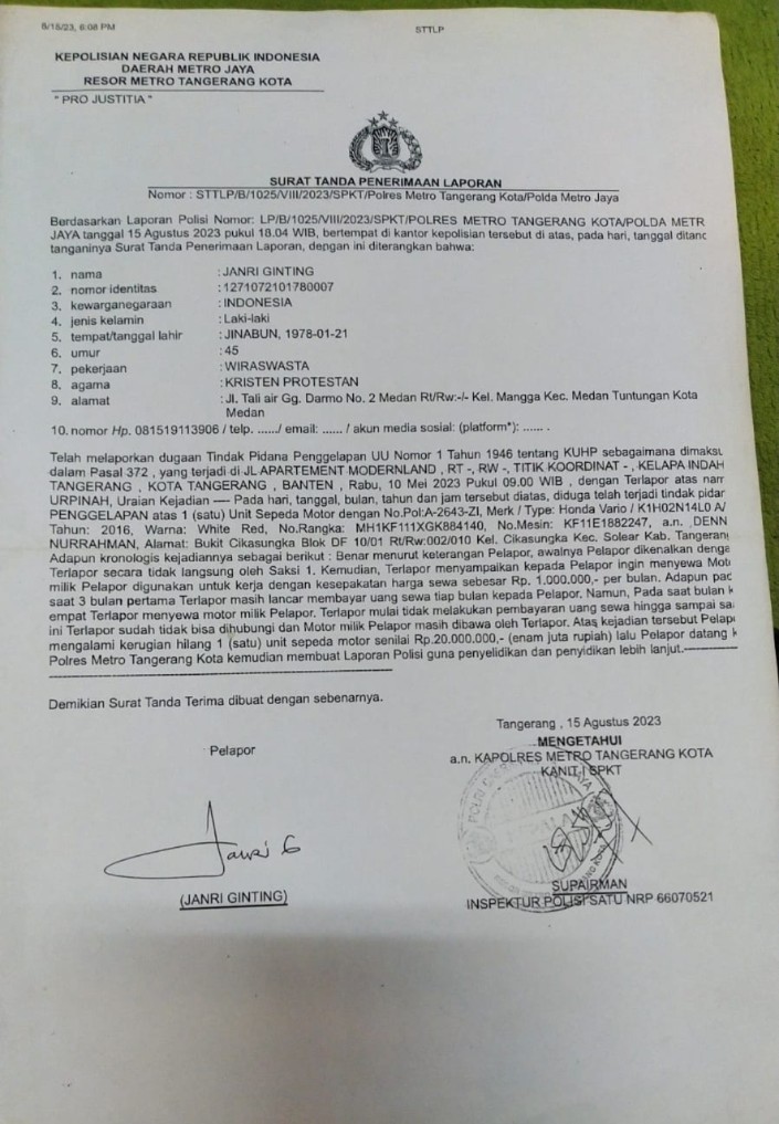 liputanKPK.com, Tangerang-Sangat prihatin sekali oknum polisi sekelas Kapolres Metro Tangerang Kota, diduga lemah dalam proses hukum sehingga terkesan tidak mampu menyelesikan kasus tindak pidana terlihat secara terang-terangan permasalahan oknum media yang berinisial JG, dengan Hendra sebagai penadah sepeda motor, hal tersebut di buktikan melalui LP yang sudah cukup lama mandek di proses mulai dari tanggal 15 Agustus 2025 sampai dengan 24 Oktober 2025 belum kunjung selesai