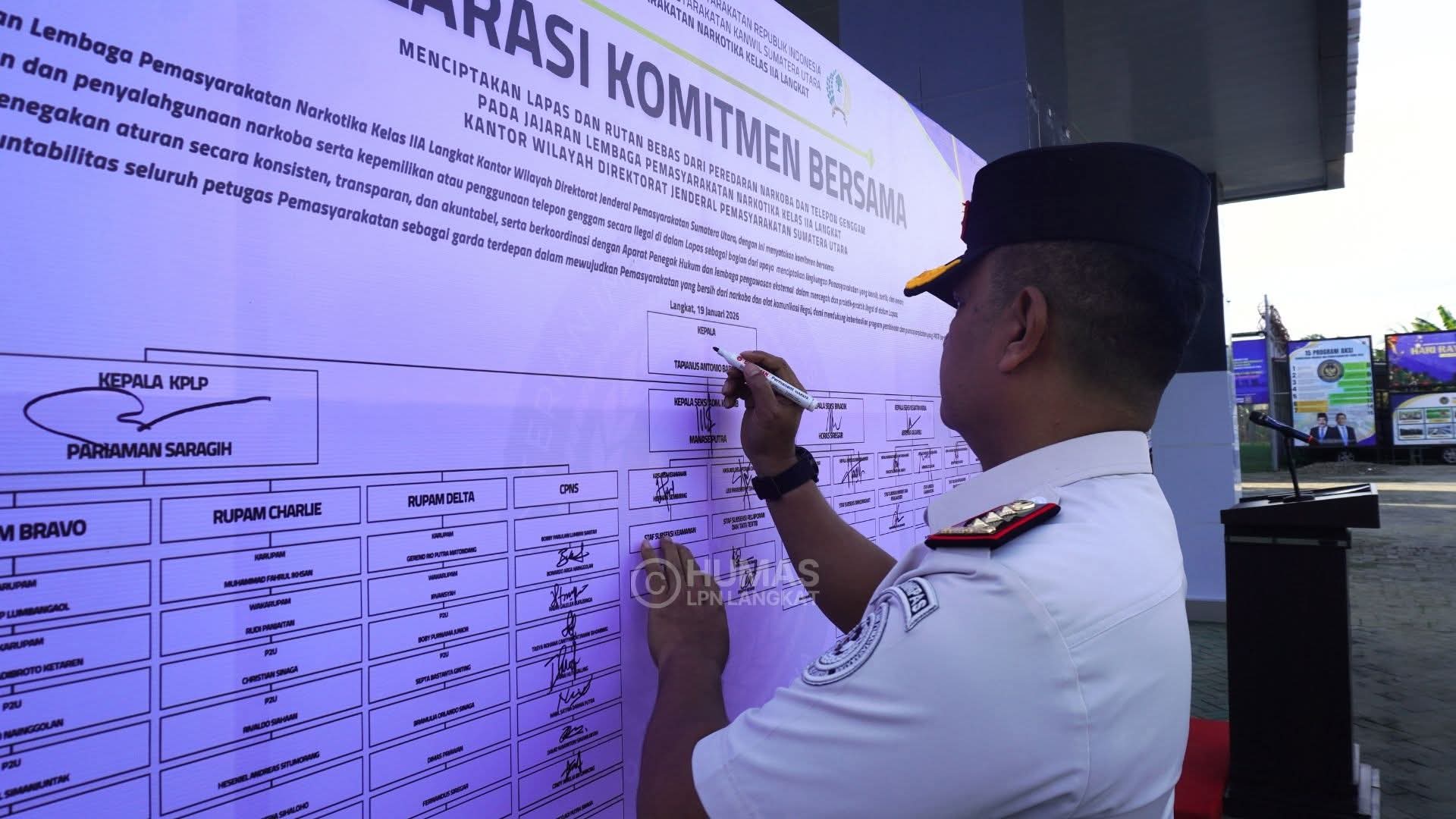 Acara kemudian dilanjutkan dengan penandatanganan Komitmen Bersama oleh jajaran pimpinan dan diikuti oleh seluruh pegawai. Penandatanganan ini menjadi simbol bahwa setiap individu di Lapas Narkotika Langkat siap memikul tanggung jawab moral dan profesional dalam menjaga marwah pemasyarakatan.