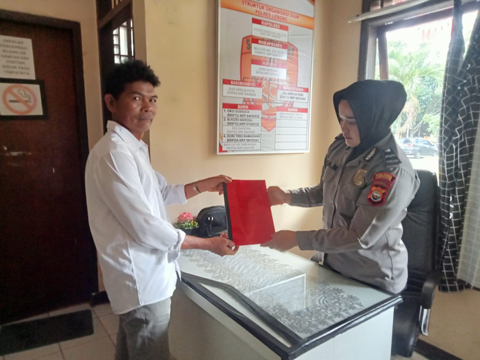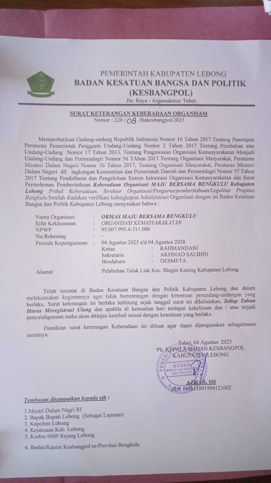 Kepala Badan Kesbangpol Kabupaten Lebong Azhar,SH langsung Penyerahan Tanda bukti pemberian surat Keberadaan Ormas Maju Bersama Bengkulu ( OMBB) kepada Ketua MPC Kabupaten Lebong Rahman Dani di kantor kesatuan bangsa dan politik senen,04/7/2025.