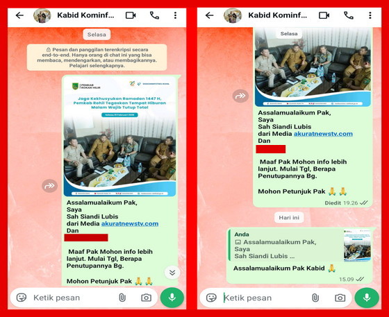 Namun hingga berita ini diterbitkan, Kepala Bidang Informasi Publik Diskominfo Rohil belum memberikan penjelasan kepada awak media terkait kapan waktu pelaksanaan penutupan tempat hiburan malam tersebut. Upaya konfirmasi yang dikirim melalui pesan WhatsApp pada Selasa (10/2/2026) tidak mendapat balasan.