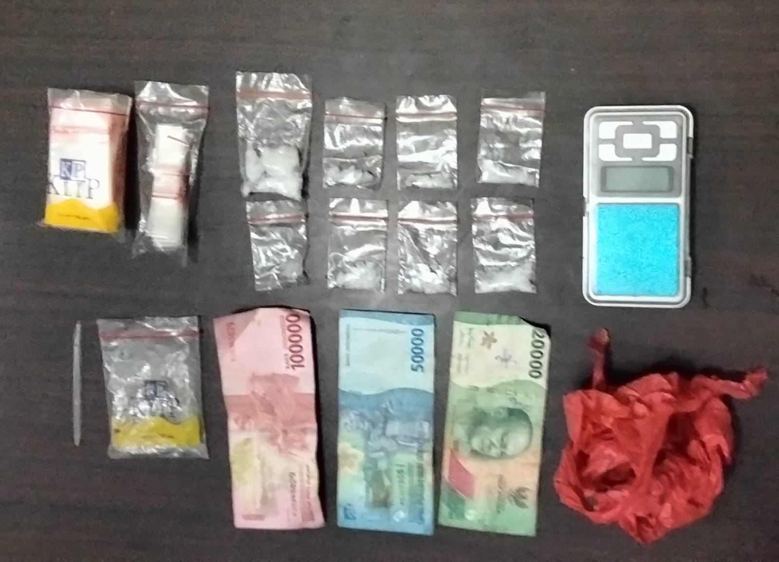 Penggeledahan yang dilakukan bersama seorang tokoh masyarakat menemukan sejumlah barang bukti, yakni delapan bungkus plastik sedang berisi sabu dengan berat bruto 11,46 gram, satu timbangan elektrik, plastik klip berbagai ukuran, serta uang tunai Rp170.000 yang diduga hasil penjualan narkotika.